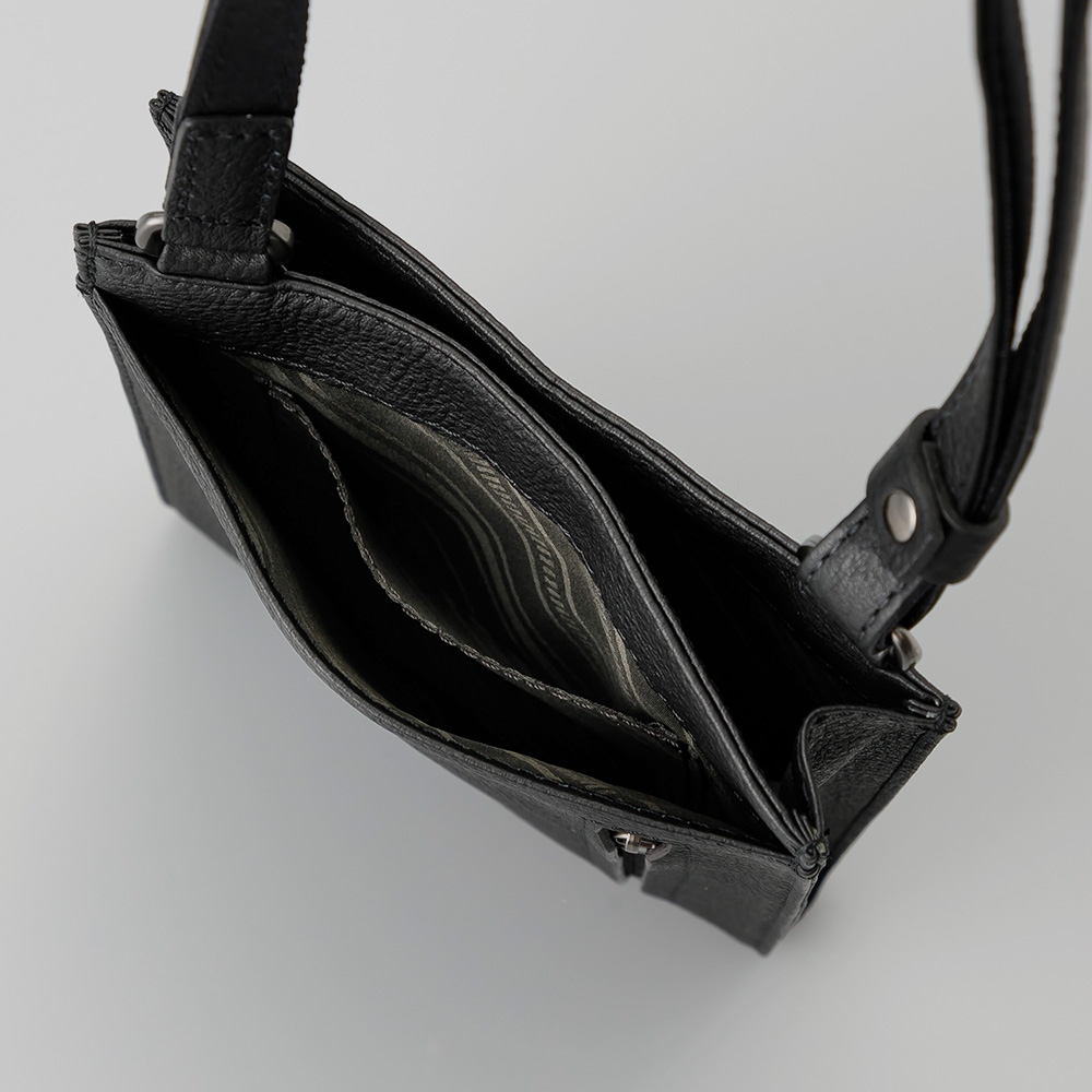 シンプルでミニマルな前面、紙幣やコイン・カードを収納できる背面、メインルームには除菌グッズなどの小物も収納でき、コンパクトながらも収納力は抜群です。お散歩や近場へのお買い物に、サッと肩にかけてお出かけいただけるちょうどよいサイズ感が魅力です。