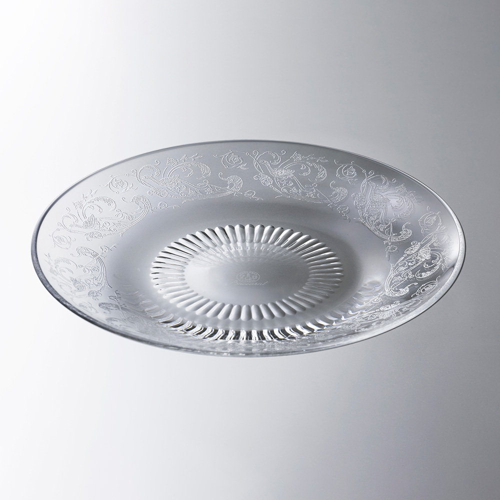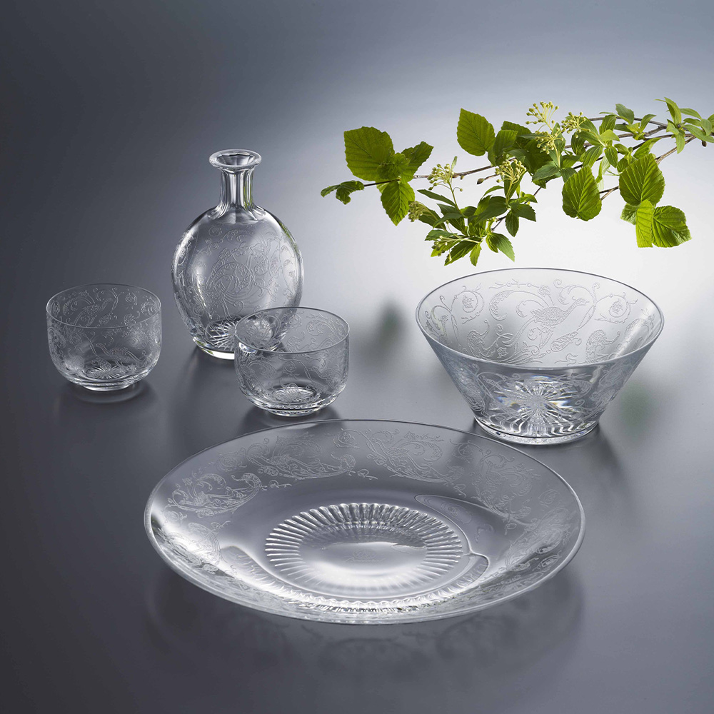 クリスタルを高度な技術で薄く繊細に成形し、鳳凰を彷彿とさせる流麗なパターンをエッチングで装飾した逸品です。手に取ったときに驚きを覚えるほどの軽やかさと優美さは、器に芸術的な美を見出し、その手触りをも愛でる日本人の食の美意識にふさわしく、四季折々の膳にひときわの趣を添えます。