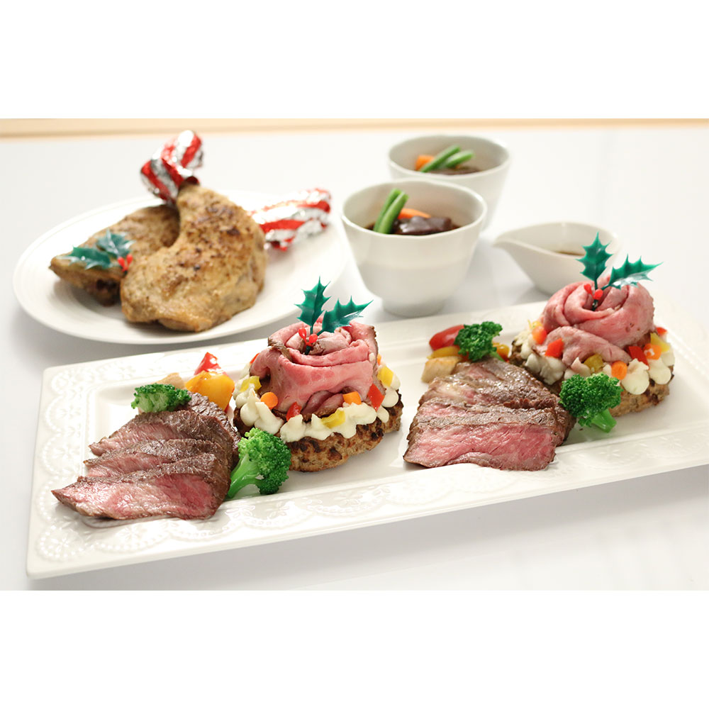 肉ケーキ(ハンバーグ80g、ローストビーフ40g、マッシュポテト25g)×2、赤身ステーキ100g、野菜のソテー(ブロッコリー、エリンギ、パプリカ)、ガーリックソース15g、ビーフシチュー200g、チキンレッグ200g×2