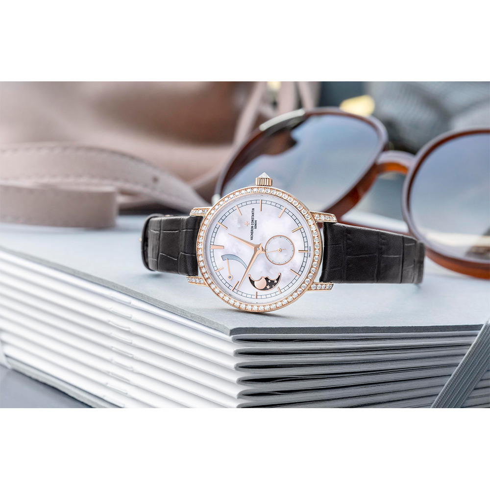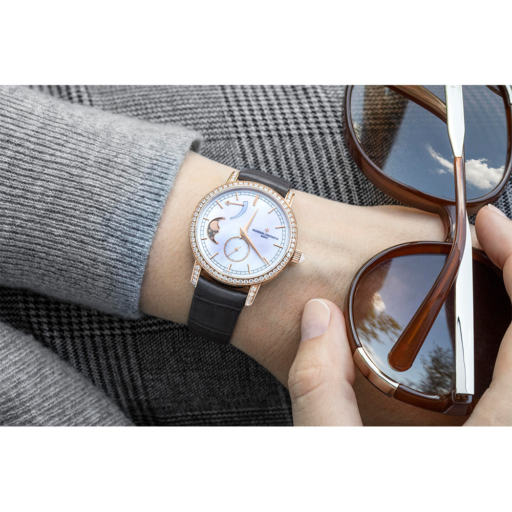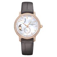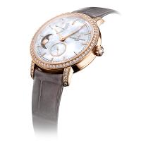 この18Kピンクゴールドの時計には、81個のラウンドカット・ダイヤモンドがセットされており、高精度のムーンフェイズが付属しています。マザーオブパール文字盤の中央にセットされたムーンフェイズには、星がきらめく夜空が取り付けられており、そのカラーはアリゲーターストラップにもさりげなく取り入れられています。この詩的なコンプリケーションは、122年に1度しか調整を必要としません。シースルーバックからは、手巻き機械式ムーブメントのたぐい稀な仕上げを眺めることができます。