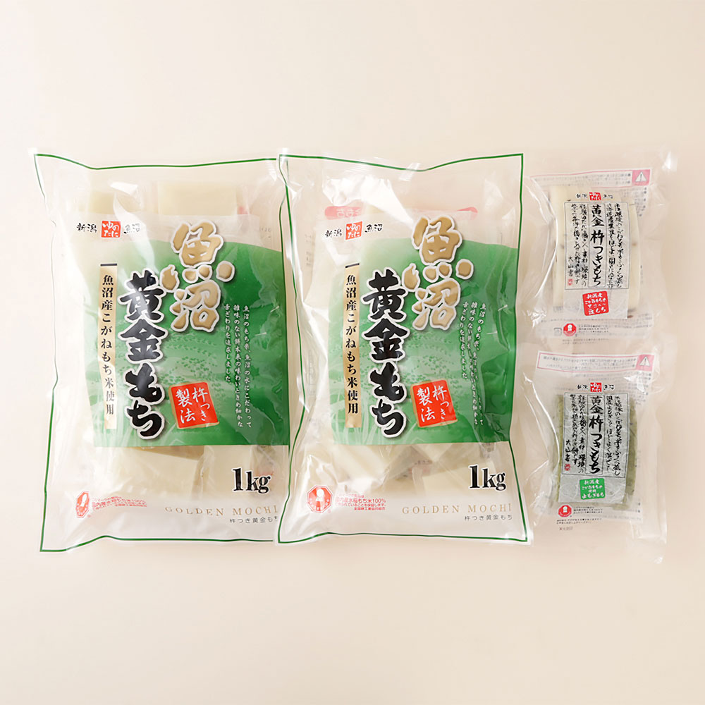 魚沼産こがねもち米100%でついた、コシのある煮崩れしにくい餅と、新潟産こがねもちに国産よもぎ・北海道産黒大豆をそれぞれ使用したお餅のバラエティセットです。