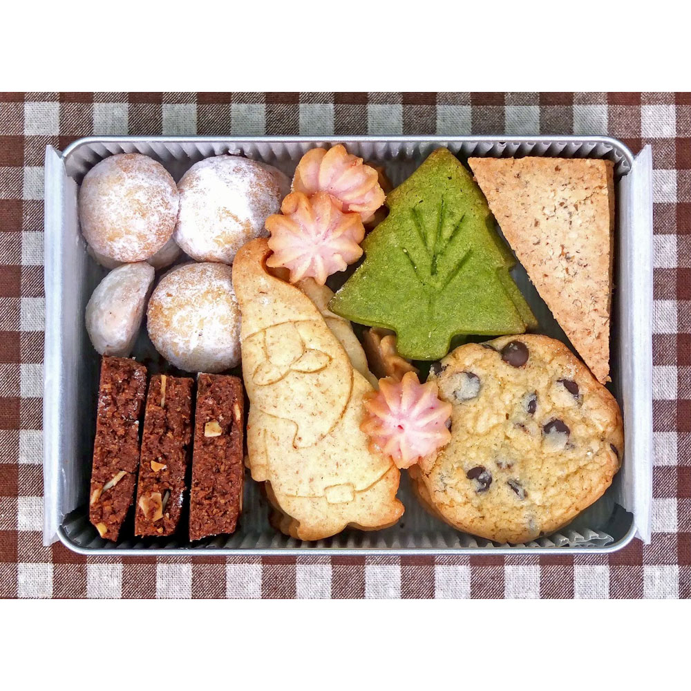 スノーボールクッキー、ラズベリークッキー、抹茶のクッキー、黒糖クッキー、チョコチップクッキー、サンタクロース全粒粉クッキー、アーモンドとチョコレートクッキー