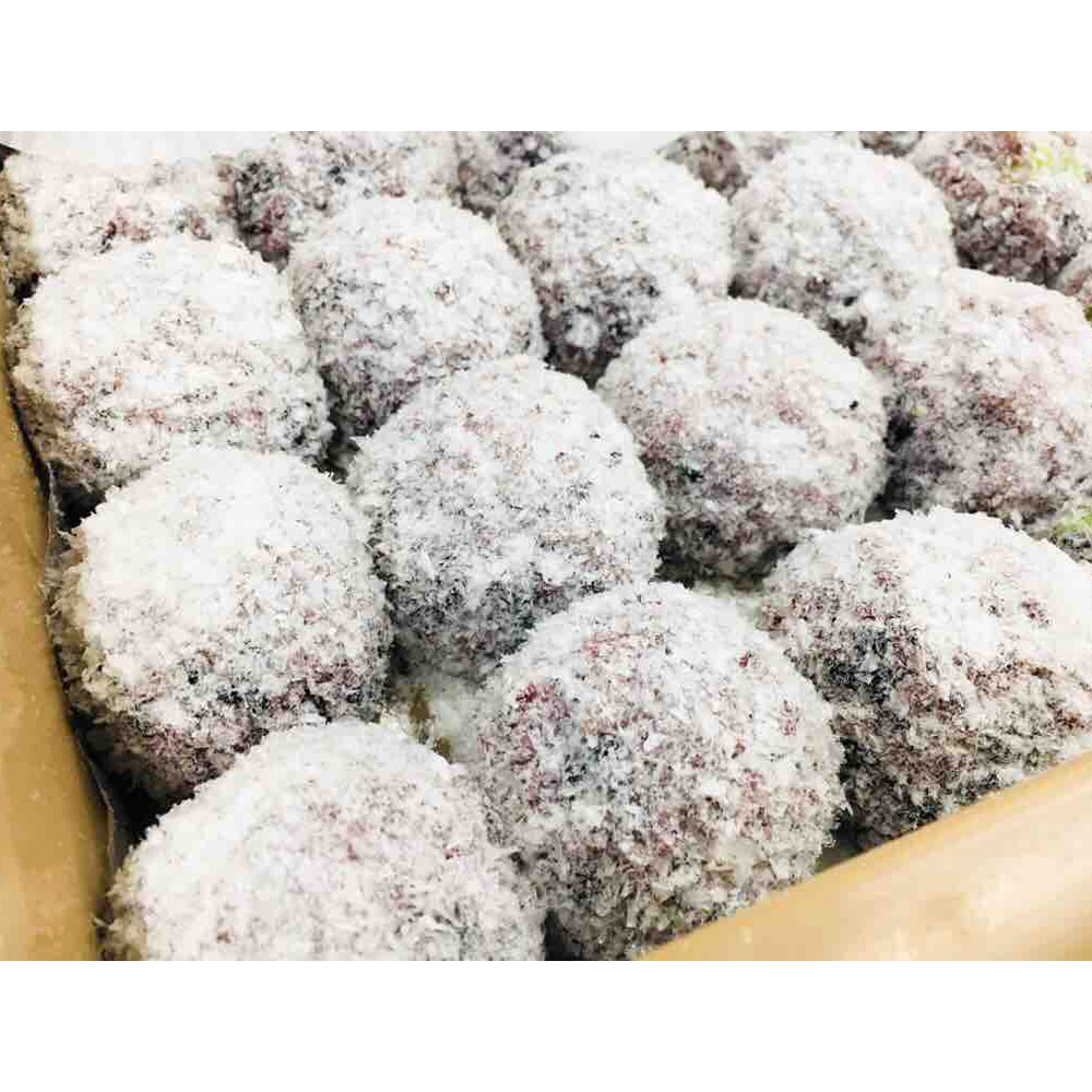 古代米を使ったつぶつぶのおはぎの餅生地にずんだあんを包んだ珍しい組み合わせのおはぎ。表面には氷餅をまぶしています。