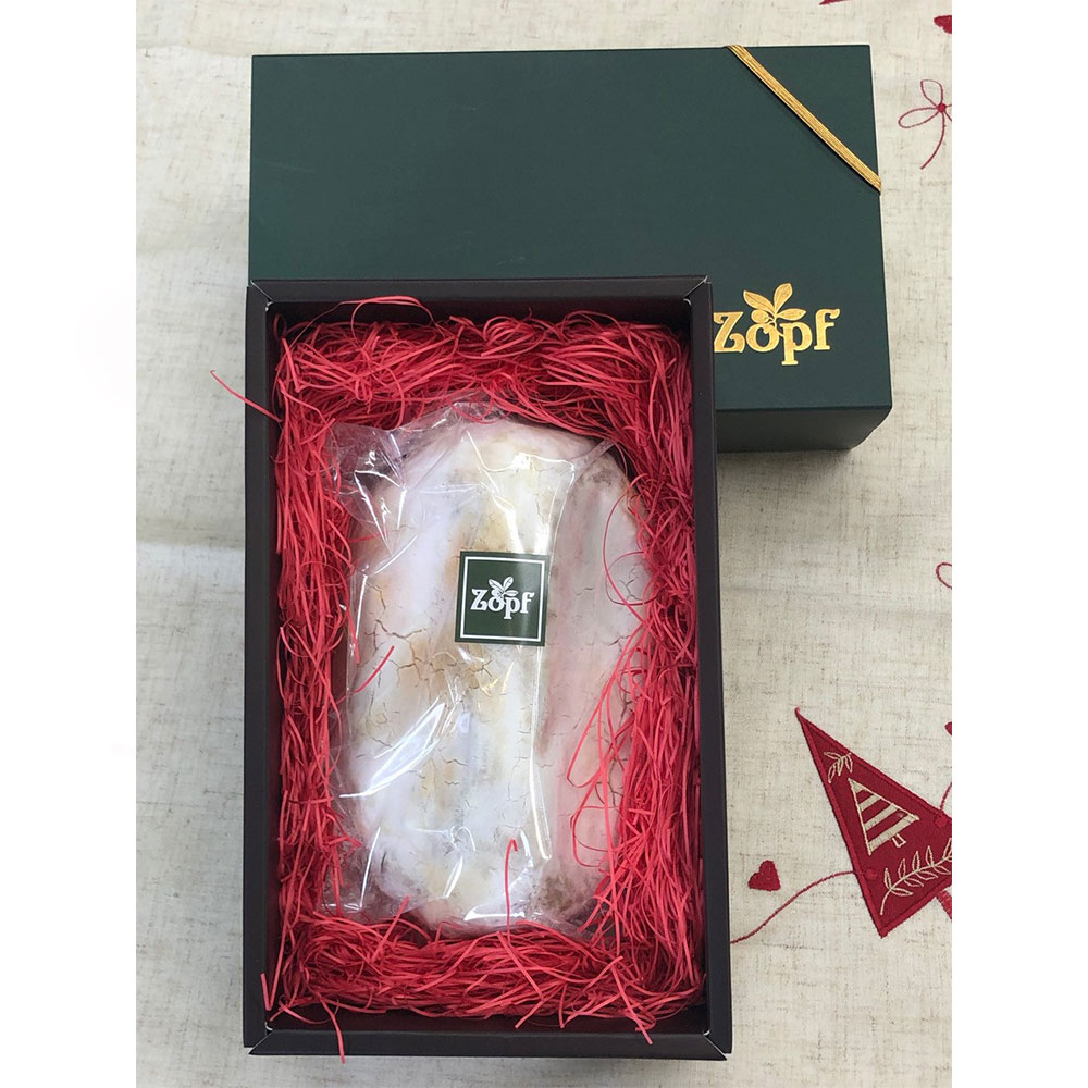 「ゆりかご」をイメージした、型に入れて焼き上げ、仕上げにたっぷりの粉糖をかけています。ふんわり、かつ、さくっとした食感が魅力で、全体が調和した、上品な味わいに仕上げました。生地には、マジパンの他に、細かくしたアーモンドをたっぷり入れ、さらにオレンジリキュールやラム酒に6ヶ月以上漬け込んでまろやかな風味に馴染んだドライフルーツ、そしてたっぷりのスパイスも入っています。