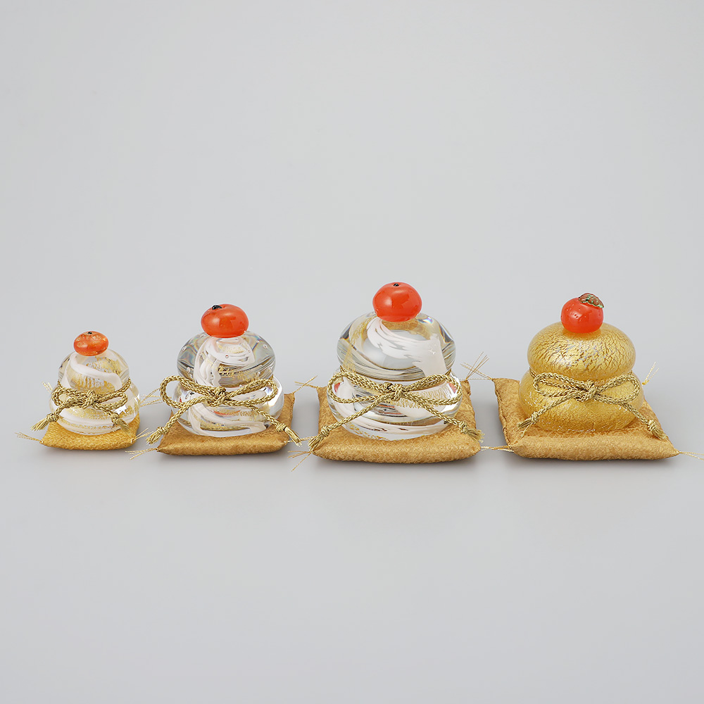 クリアな鏡餅の中には流れるような白と金のスパイラルの模様が。手仕事の面白味を感じられるとっておきの鏡餅です。中~大サイズは玄関やリビングの棚の上等で映えそうなサイズ感。お正月気分をしっかり感じられそうです。贈りものにもお勧めです。