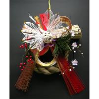 太いしめ縄と幸運が舞い上がる大きな鶴、難を転ずると云われる南天、不老長寿を意味する松葉と春らしい桜をあしらった、ボリューム感溢れる縁起の良いお正月飾りです。