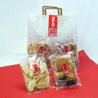 福袋(おかき4袋入)、彩味揃(5種類のおかき詰合せ)、福招き揃赤、福招き揃白、福々亀の5つが入った盛りだくさんの新春福袋。招き福の赤い袋には堅めのおかきが5種類、白の袋にはサックリとした食感のおかきが6種入っています。福々亀は、縁起の良い亀をぷっくりとかわいらしく焼き上げました。職人の想いが詰まったバラエティ豊かなお煎餅、おかきの詰め合わせを皆様でお楽しみください。