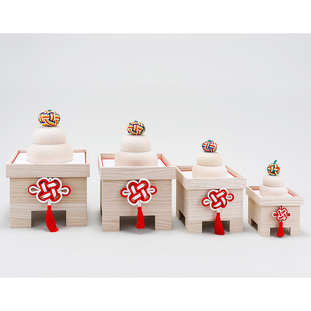 凛とした木の美しさと鮮やかな組紐の飾りのインパクトが魅力のモダンな鏡餅です。