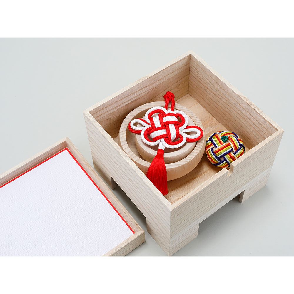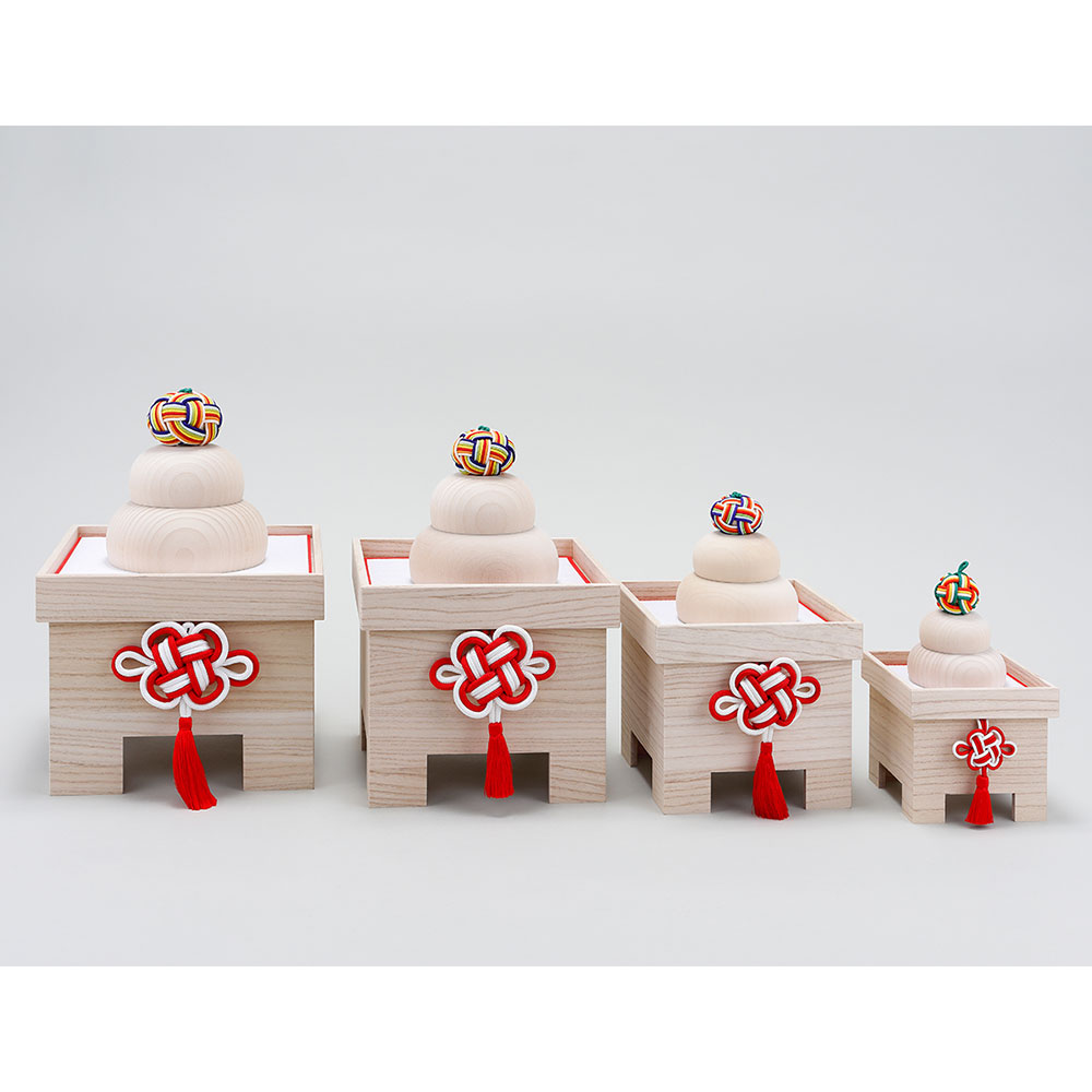 今の暮らしのスタイルにすっと溶け込むモダンな鏡餅です。新しい年を晴れやかな気持ちで迎えるために、日本の材料にこだわって制作されたとっておきの鏡餅を飾りませんか。あえて漂白や塗装をせずに美しいシナ材を丁寧に仕上げた餅。ダイダイは絹の唐打紐を「亀結び」して、魔除けと長寿と富貴を象徴しています。三宝に付けた飾り結びは、「菊結び」で延命長寿を表します。桐材でつくられた外箱を、三宝としてご使用ください。出番が終わったら、大きい餅の中に小さな餅、ダイダイをコンパクトに収納することが出来ます。