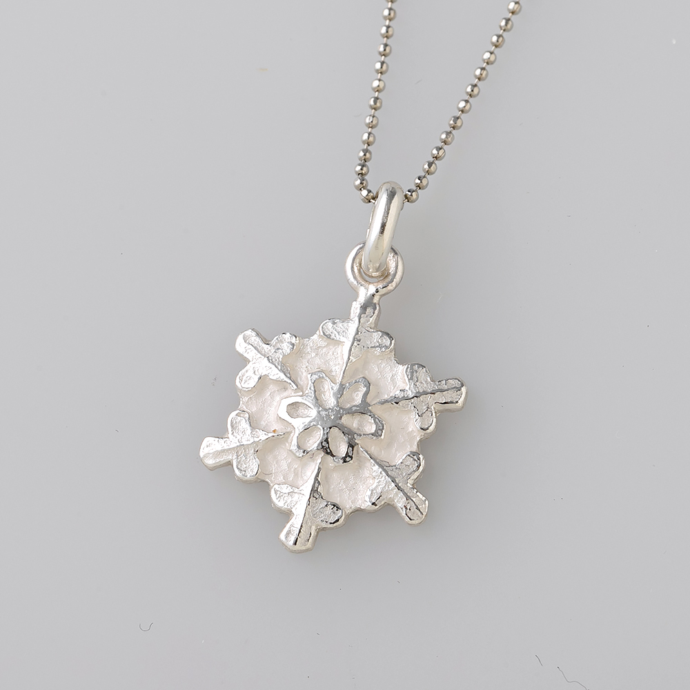 上品な六花の雪の結晶をモチーフにしたペンダント。雪の結晶らしいシルエットと、シルバーならではの質感を生かし、さりげないながらも存在感のある彫金作品です。日常使いはもちろん、パーティーなど特別な機会での着用、ギフトにもおすすめです。伝統的な彫金の技法である「タガネ」を用い、全体に艶消しの彫りを施し、メリハリのある磨きを入れることにより、シルバーならではの濃淡のある奥行きを表現しています。