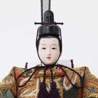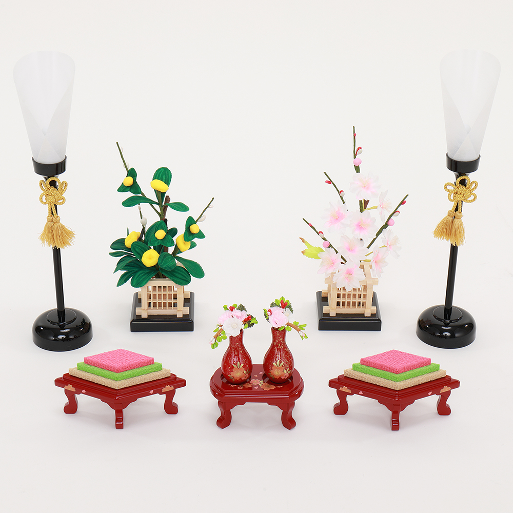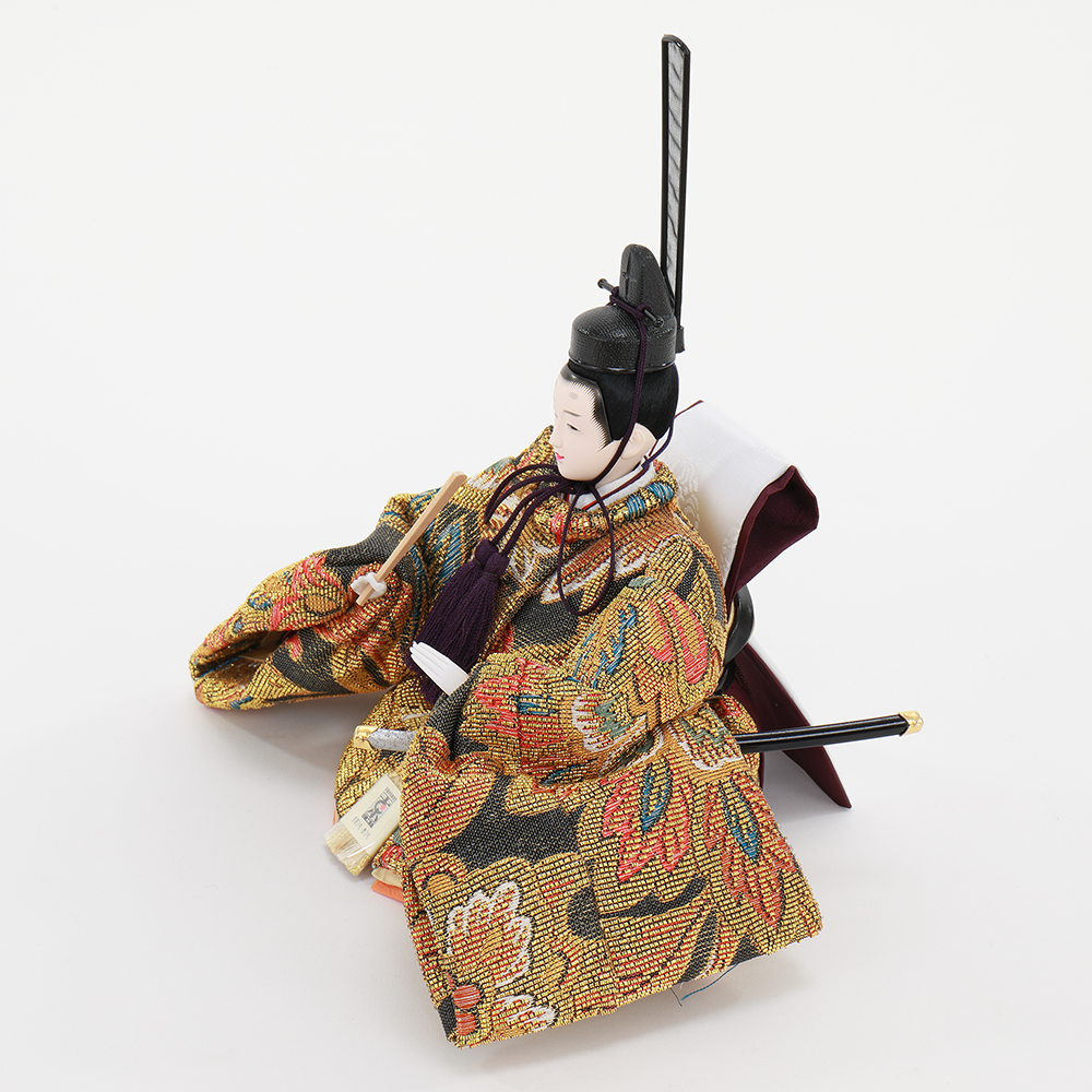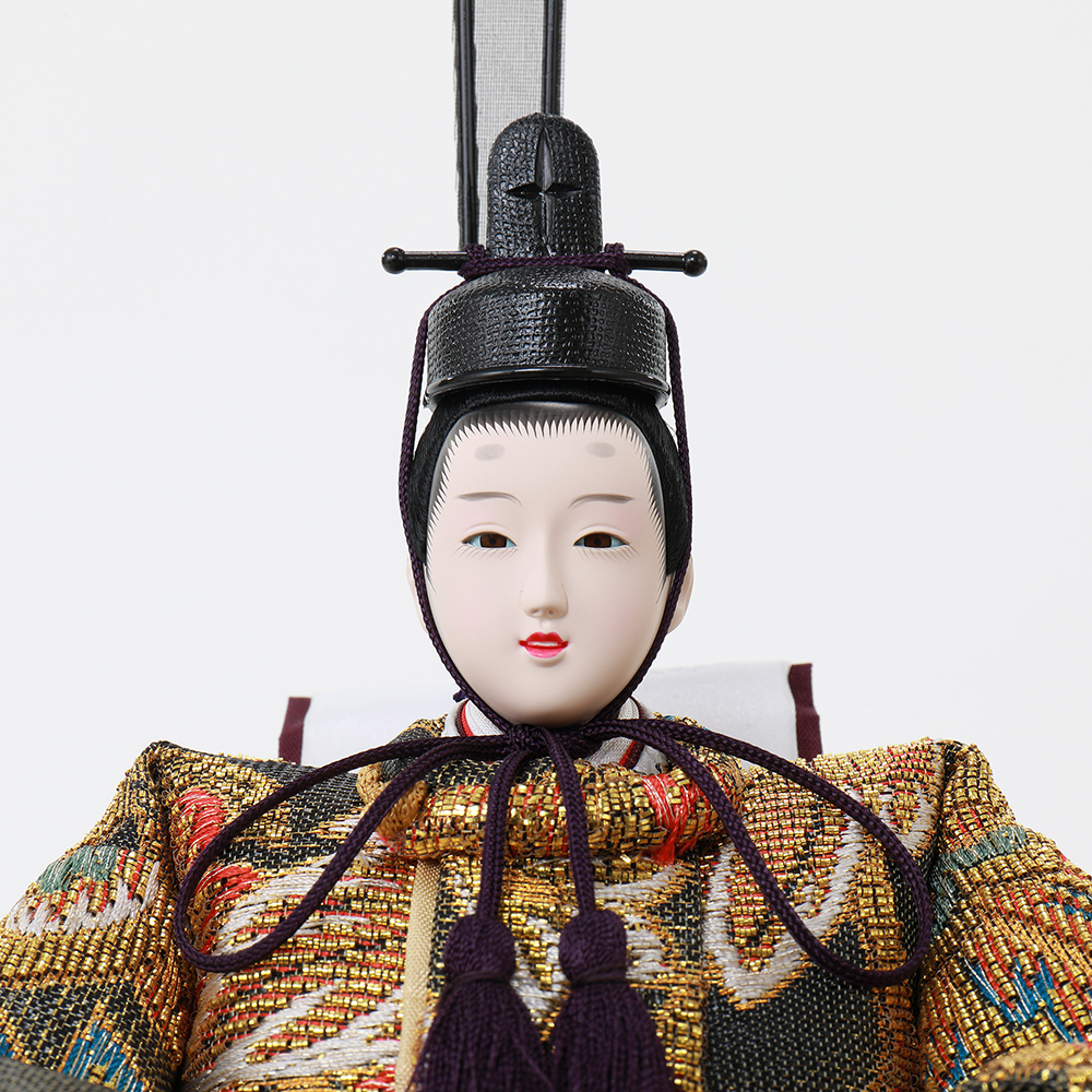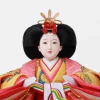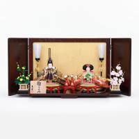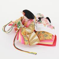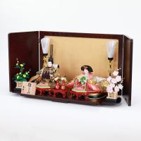 艶やかに仕立てられた、豊かな趣の衣裳が映えて。おひな様は、袋帯の衣裳を着せ付けました。木目調の屏風・飾り台は一体型になっています。