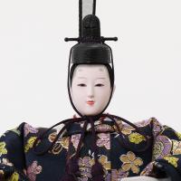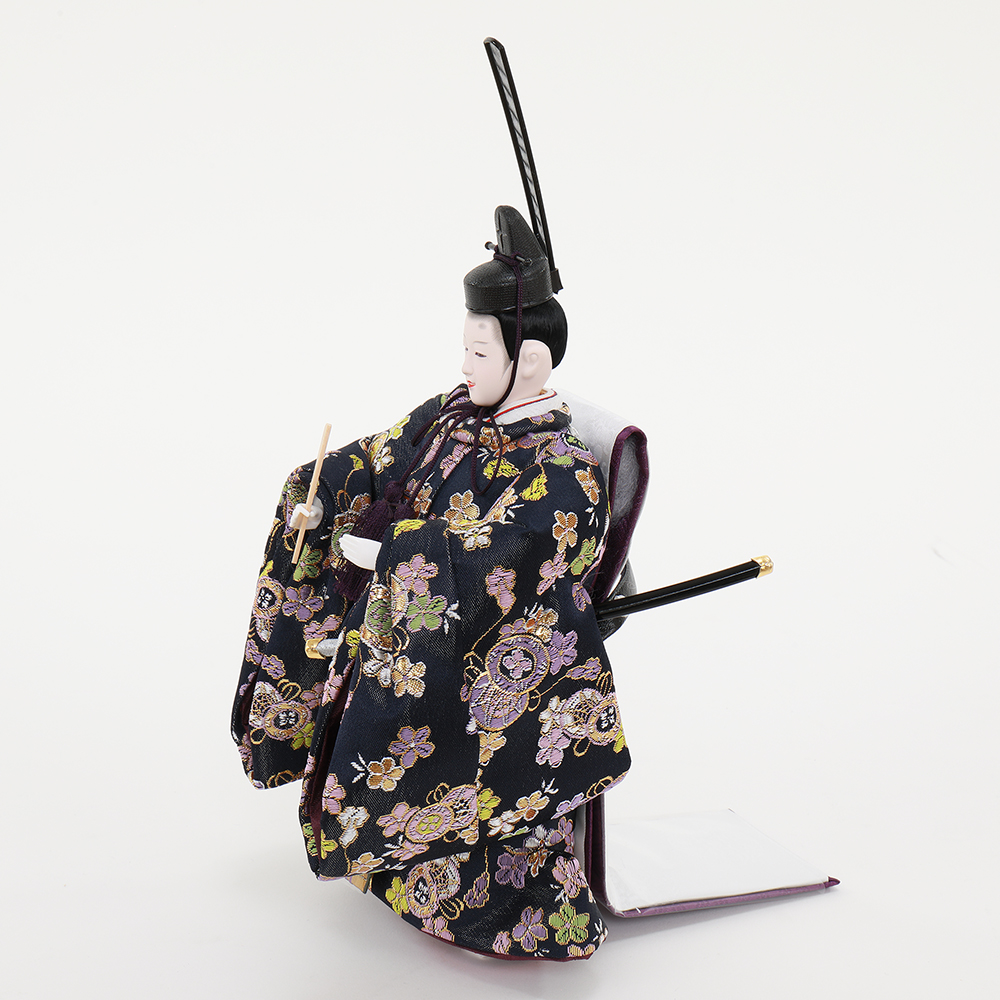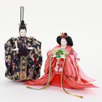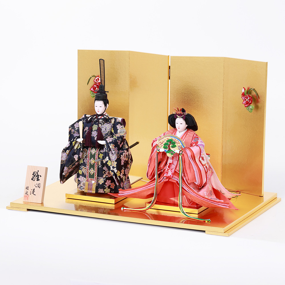 艶やかに仕立てられた、豊かな趣の衣裳が映えて。華やかな金色の屏風・飾り台に落ち着いた衣裳の立雛をセットしました。屏風にはバラをイメージした飾り物が付いています。