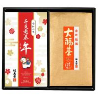 新年の万福息災を祈念して、かりがね(茎茶)に干梅と昆布を合わせた大福茶とまったりとした旨味と爽やかな渋味が調和した干支煎茶の詰め合わせです。