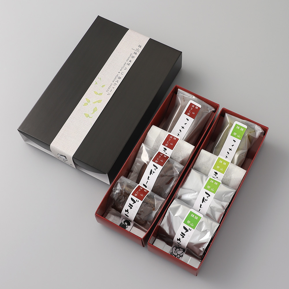 抹茶キャラメルサンド、抹茶マドレーヌ、抹茶ブラウニー、抹茶フィナンシェ、ほうじ茶キャラメルサンド、ほうじ茶マドレーヌ、ほうじ茶ブラウニー、ほうじ茶フィナンシェ 各1個
