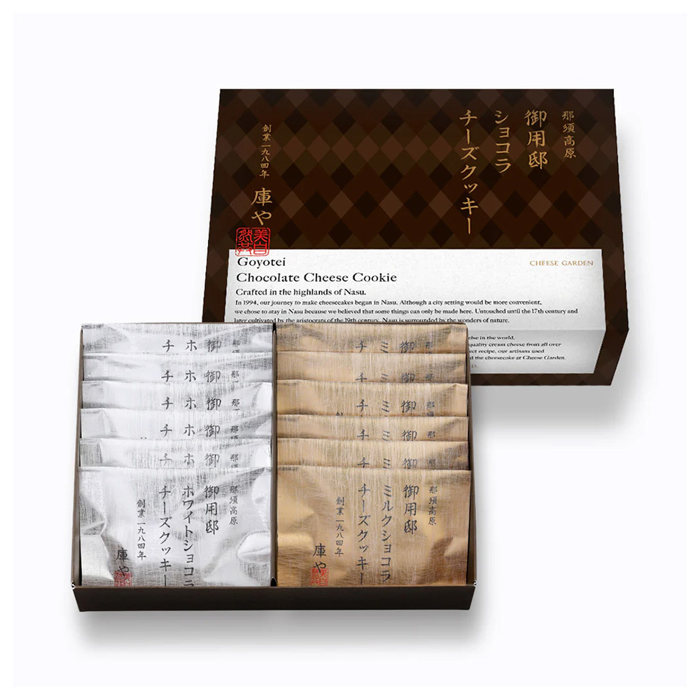毎年人気の冬季限定商品「御用邸ホワイトショコラチーズクッキー」と「御用邸ミルクショコラチーズクッキー」の2つの味が楽しめるアソートボックスです。ホワイトチョコとミルクチョコの甘みが濃厚チーズとブラックペッパーのクッキーをさらに美味しく引き立てます。