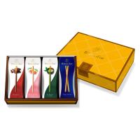 フローラルな香りのエクアドル産カカオ豆を使用した〈ショコラ〉、コクのあるホワイトチョコレートに白いちごの甘酸っぱさと芳醇な香りが引き立つ〈白いちご〉、上品な香りと苦みの心地よい余韻が楽しめる〈宇治抹茶 丸久小山園〉の定番品3種に加え、バトンドール定番人気の〈シュガーバター〉を詰め合わせたギフトセットです。