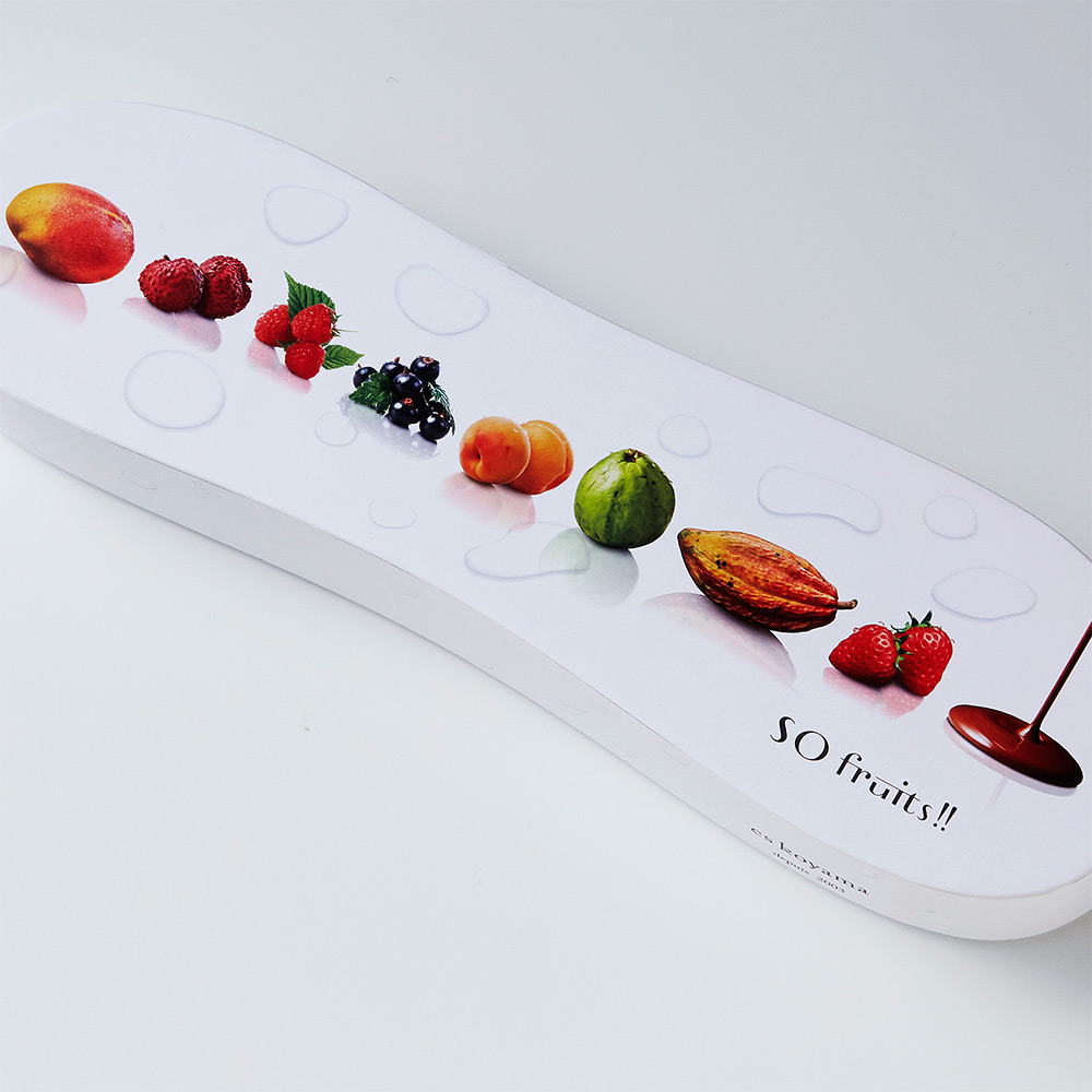 「ボンボンショコラの楽しさを世の中に伝える」。このテーマのお手本のようなショコラを創ろうと思い、馴染み深い「フルーツ」をテーマに、8種類のボンボンショコラを生み出しました。それぞれのフルーツにフィットするカカオを世界中の産地から選出。果肉や果汁が持つ甘みや酸味だけでなく、皮や葉、種の持つ香りや苦みも味わいに複雑味や深みを生む大切な要素として捉え、「フルーツの本質」を表現しました。ガナッシュとパート・ド・フリュイのマリアージュが、味わいに深みと心地よい余韻をもたらします。