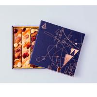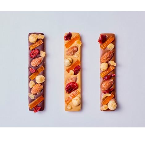 上質なダークチョコレート、ミルクチョコレートと日本では珍しいブロンドチョコレートに、ナッツとドライフルーツがふんだんに乗ってキラキラと輝く宝石のようなショコラバーが誕生しました。ザクザクとした歯応えと共に、口の中で広がるチョコレートのなめらかさとナッツの香ばしさ、最後にはドライフルーツの酸味がフワッと香る大満足のチョコレート商品です。ご自宅用、プレゼント用にぴったりの商品です。