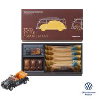 ビートル(Type1)と、ビートルを基に作られたバス(Type2)が隣に並び、タイヤの位置がぴったりと重なる様子を、クッキーとチョコレートで表現。3つの味わいのビートル型チョコレートとアソートしました。ブラックのカブリオレミニカー付き。本品は洋酒不使用です。
