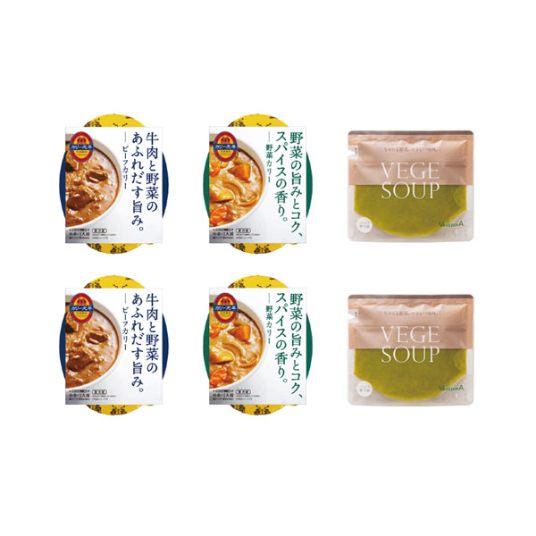 ビーフカリー 210g×2、野菜カリー 230g×2、10種野菜のグリーンポタージュ 170g×2