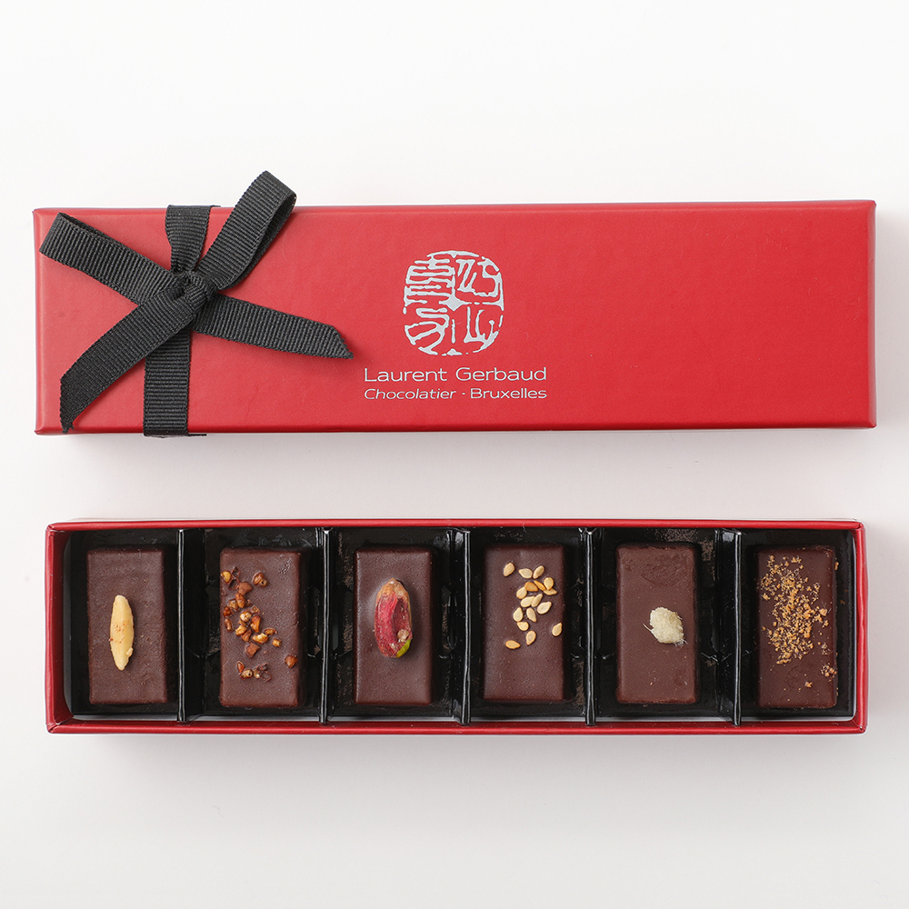 プラリネに絶対の自信をもつローラン・ジェルボーおすすめの6種(ピスタチオ、セサミ、アーモンド、スペキュロス、バックウィート、ジンジャー)のアソート。豊かで芳醇な素材感を感じさせる一品です。