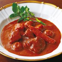 黒毛和牛のすね肉を赤ワインでじっくりと煮込みました。人参、たまねぎ、マッシュルーム、ヤングコーンなどの野菜も素材感を残して仕上げた、具だくさんのビーフシチューです。