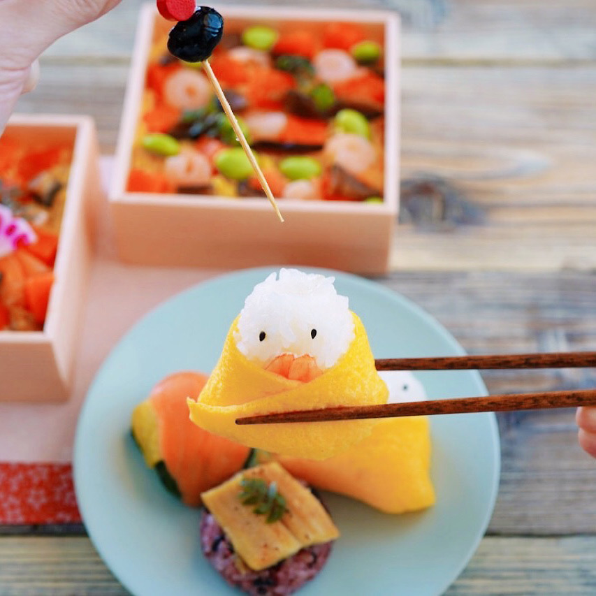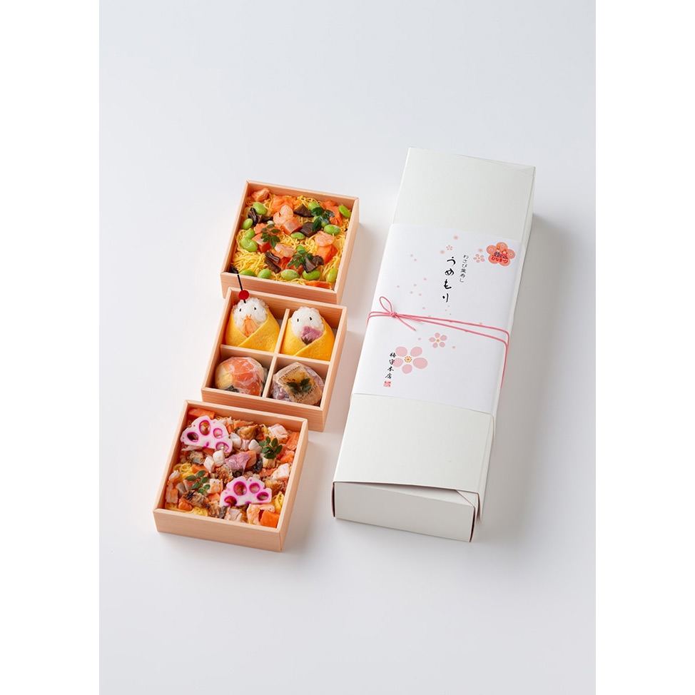 うめもりオリジナルの手鞠わさび葉寿しとひな祭り限定の手鞠寿しの詰め合わせました。ひな祭りを愛でるお内裏様とお雛様の手鞠寿しと、色彩豊かな2種類のちらし寿司が、お子さまの大切な日を彩ります。春を感じる逸品です。