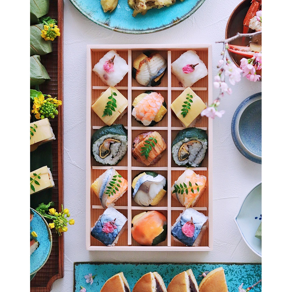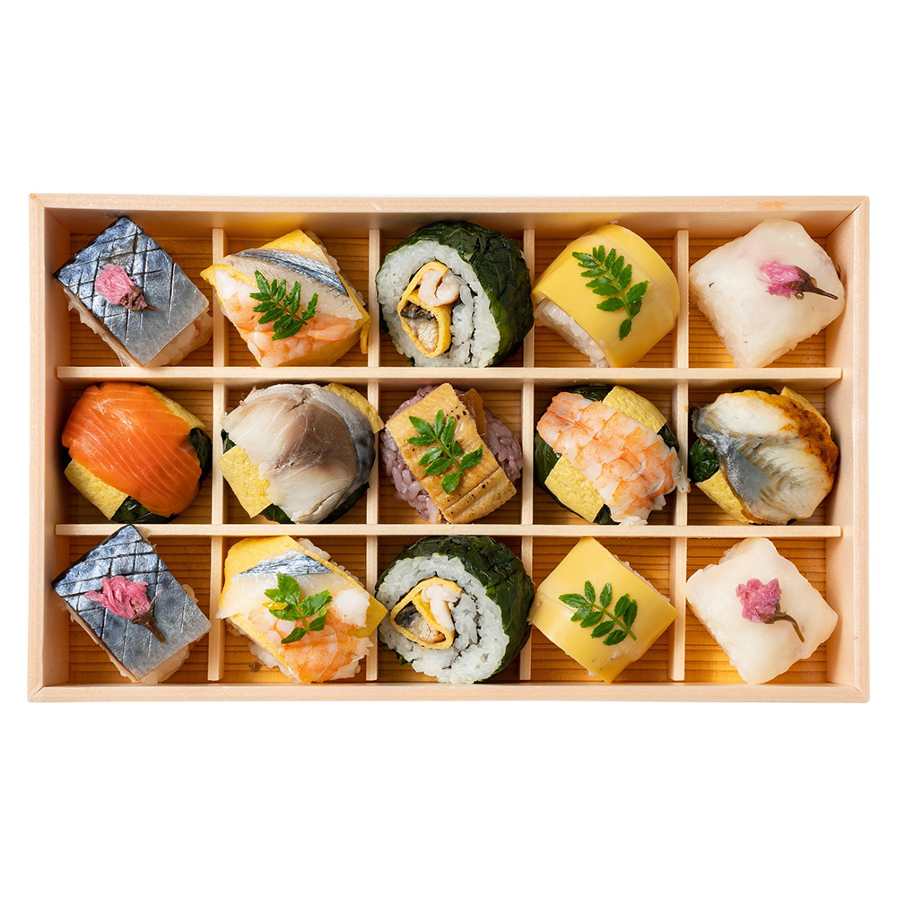 桜のしめ鯖棒寿司・海老と細魚の手綱巻・わさび巻・竹の子棒寿司・桜かぶら棒寿司 各2個、手鞠わさび葉寿し 鮭・手鞠わさび葉寿し 鯖・古代あなら寿し・手鞠わさび葉寿し 海老・手鞠わさび葉寿し 鰻 各1個 計15個