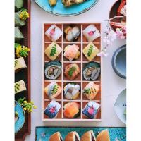 桜を散りばめた、ころんと愛らしい10種類の手鞠寿しをお届けします。