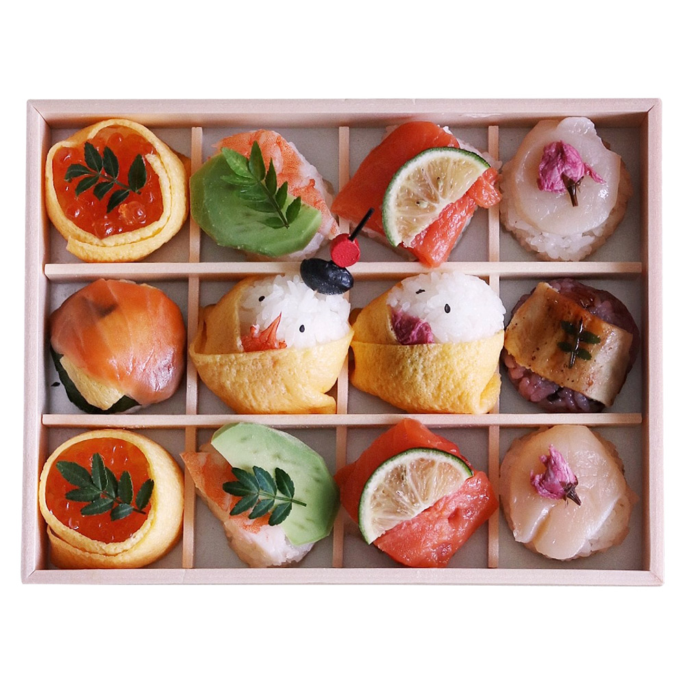 いくら錦糸巻・海老とアボカドの手網巻・鮭の押寿司・さくら帆立手鞠 各2個、わさび葉寿し鮭・お内裏様手鞠・お雛様手鞠・古代あなら寿し 各1個 計12個