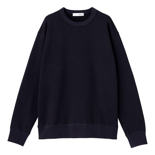 三重県で唯一無二のコットンを手掛けるスマイルコットン社の素材を使用したアンダーウェアやリラクシングを展開する「HAAG」。「わたの繊維」を撚って作られた糸を一度わざわざほぐして再度糸にすることで、糸を構成する繊維の間に空気が含まれ、ふんわりと柔らかい肌触りと着心地を実現。保温性と吸湿性にも優れています。セットインスリーブでルーズフィットに仕上げています。肩から袖にかけての自然な落ち感が特徴です。ふんわり軽い着心地でルームウェアからタウンウェアまで幅広くで着用していただけます。生地は細番手で目を飛ばし甘く編む事により、ふんわり柔らかな風合いを実現いたしました。薄手で軽く、年間通して使用出来る裏毛素材です。