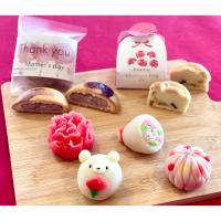 季節の創作上生菓子4個(「カーネーション赤(こしあん入煉切製)」、「ドット花手まり(いちごあん入り煉切製)」、「お花白クマちゃん(白あん入煉切製)」、「花束(白あん入煉切製)」×各1個)、カーネーション箱入焼菓子(白あんサツマイモ入)×2個、母の日焼菓子(みじん栗入りこしあん)×2個