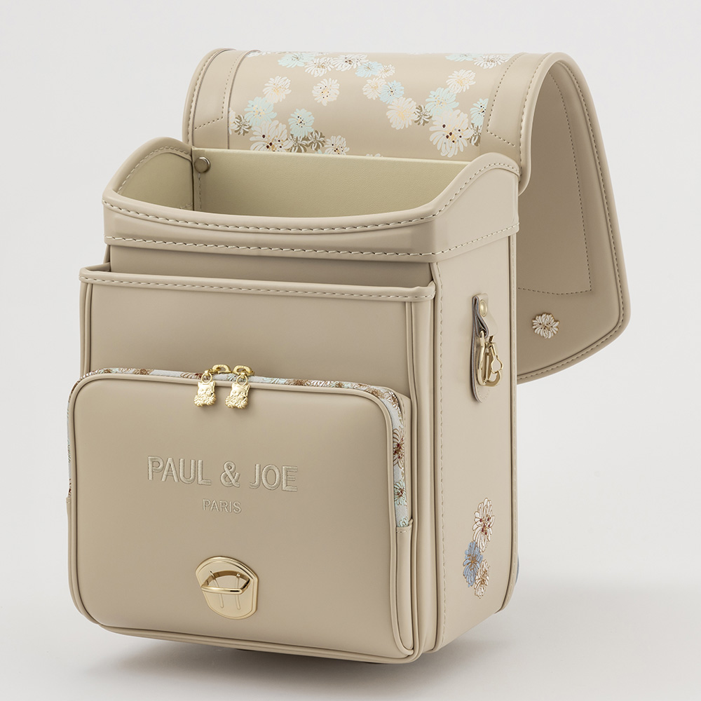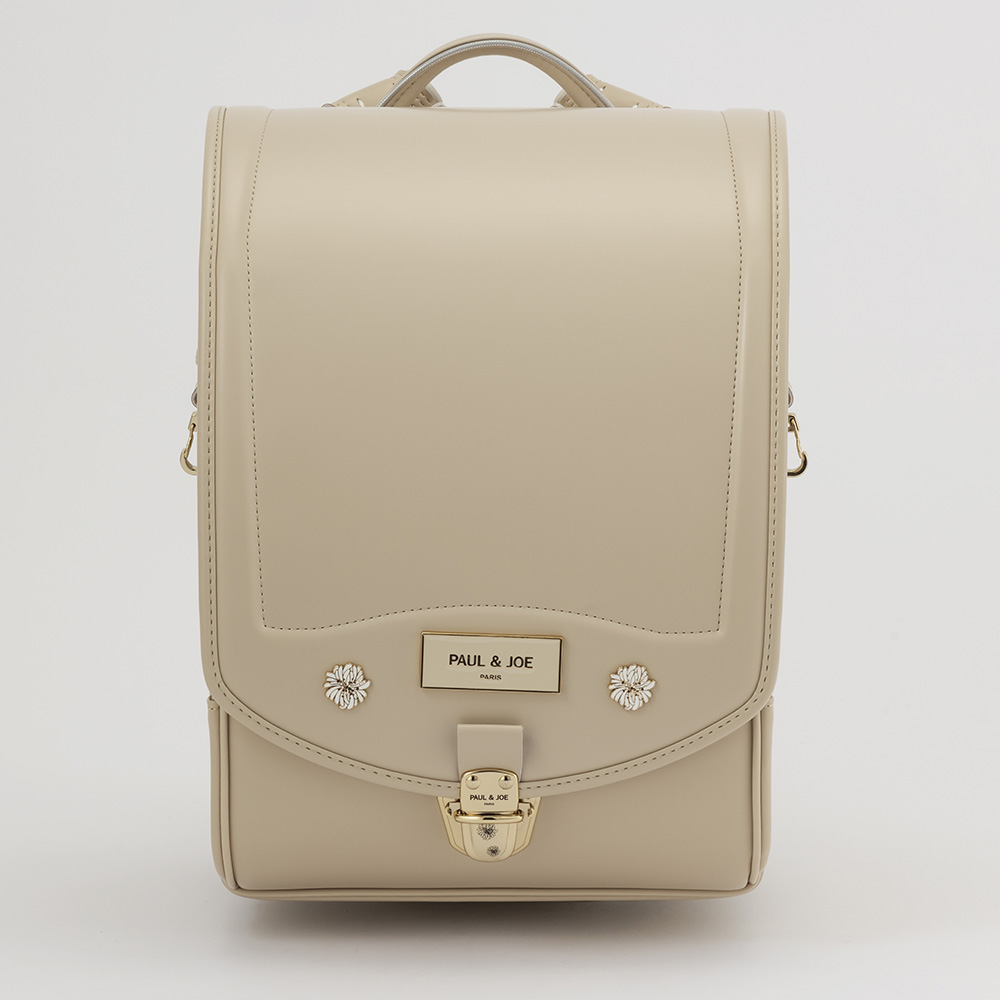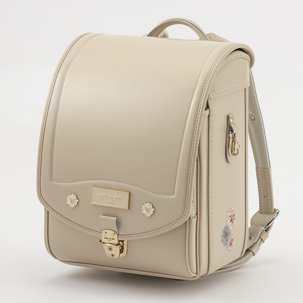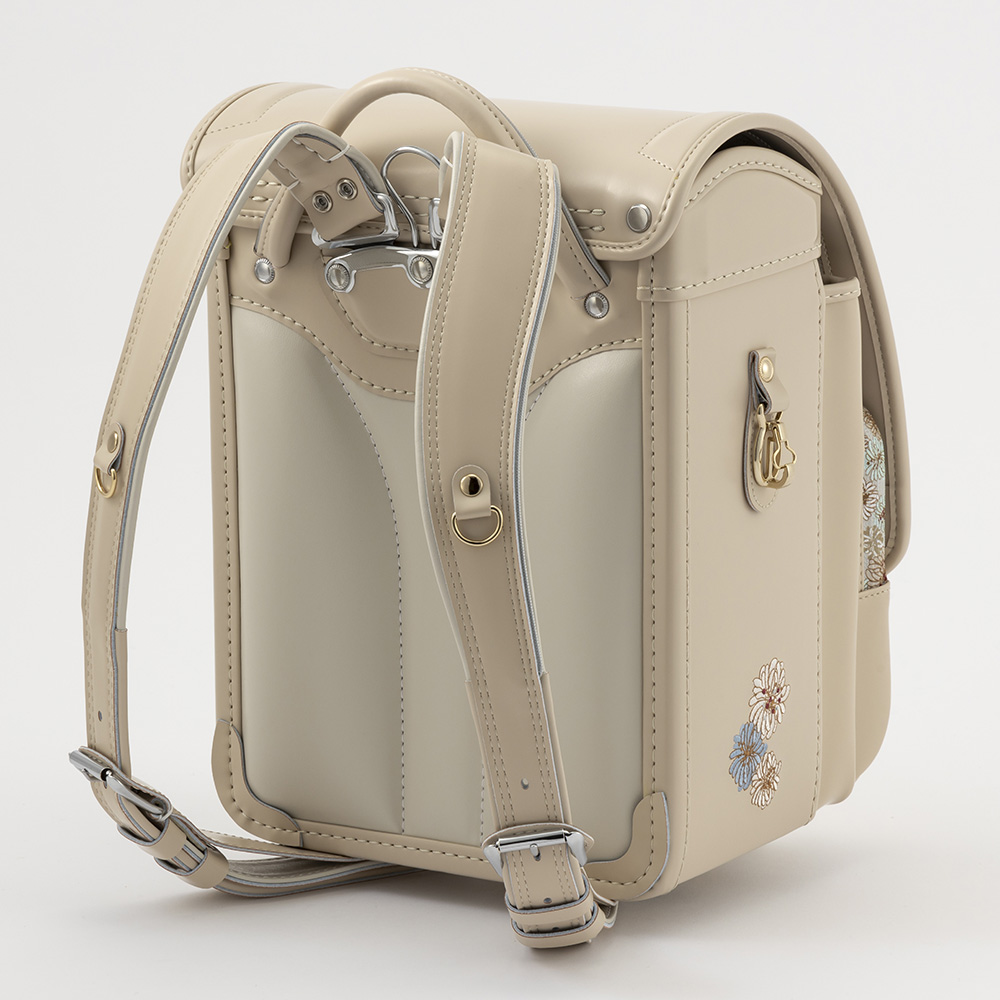 クリザンテームがプリントされた差し込み式のオリジナル錠前を採用。独立式のダルマカンは左右にスライドすることができ、お子様の成長に合わせて調節可能です。フィットちゃんや口前補強といった機能性も備わったキューブ型ランドセル。