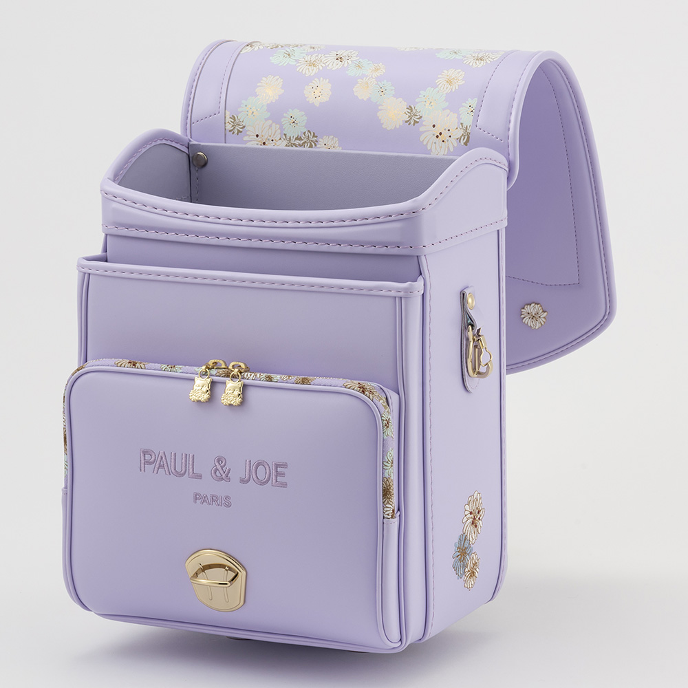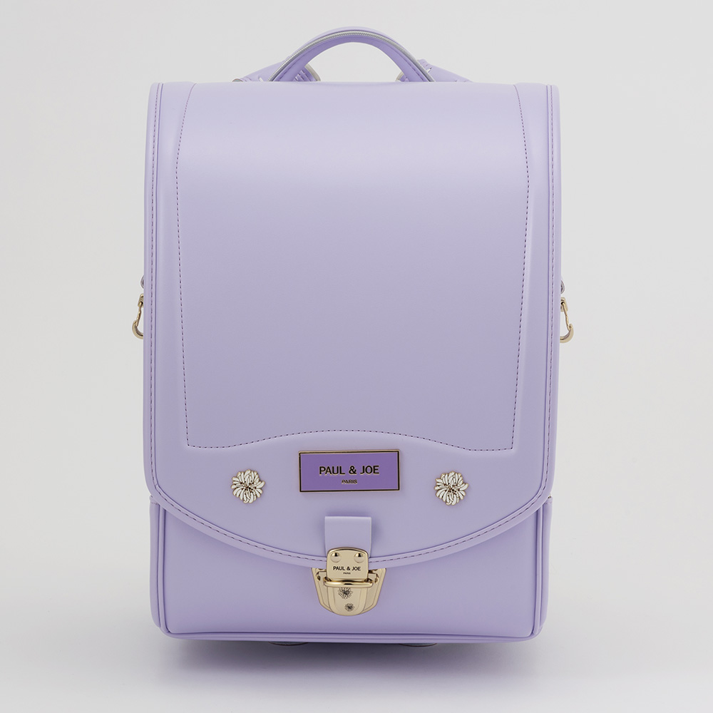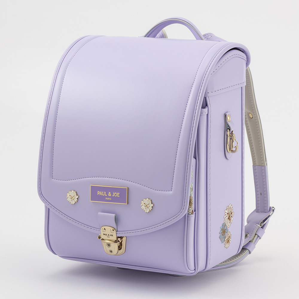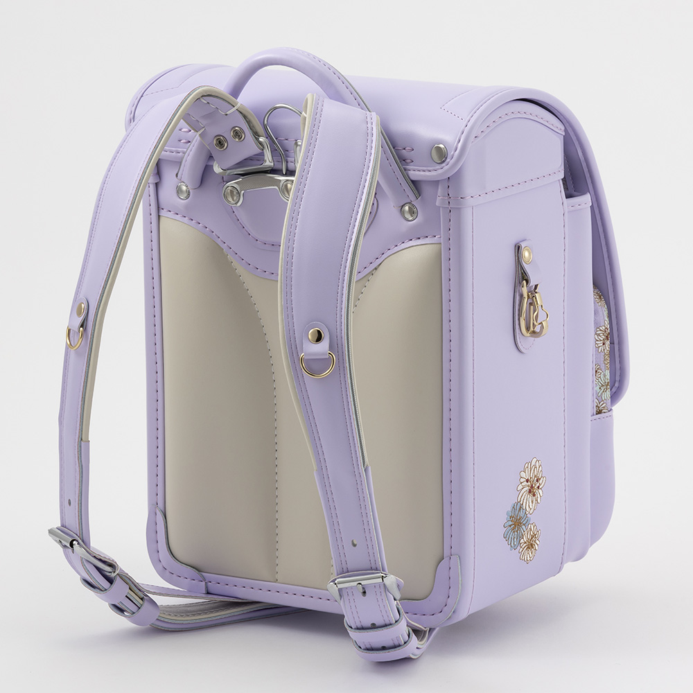 クリザンテームがプリントされた差し込み式のオリジナル錠前を採用。独立式のダルマカンは左右にスライドすることができ、お子様の成長に合わせて調節可能です。フィットちゃんや口前補強といった機能性も備わったキューブ型ランドセル。