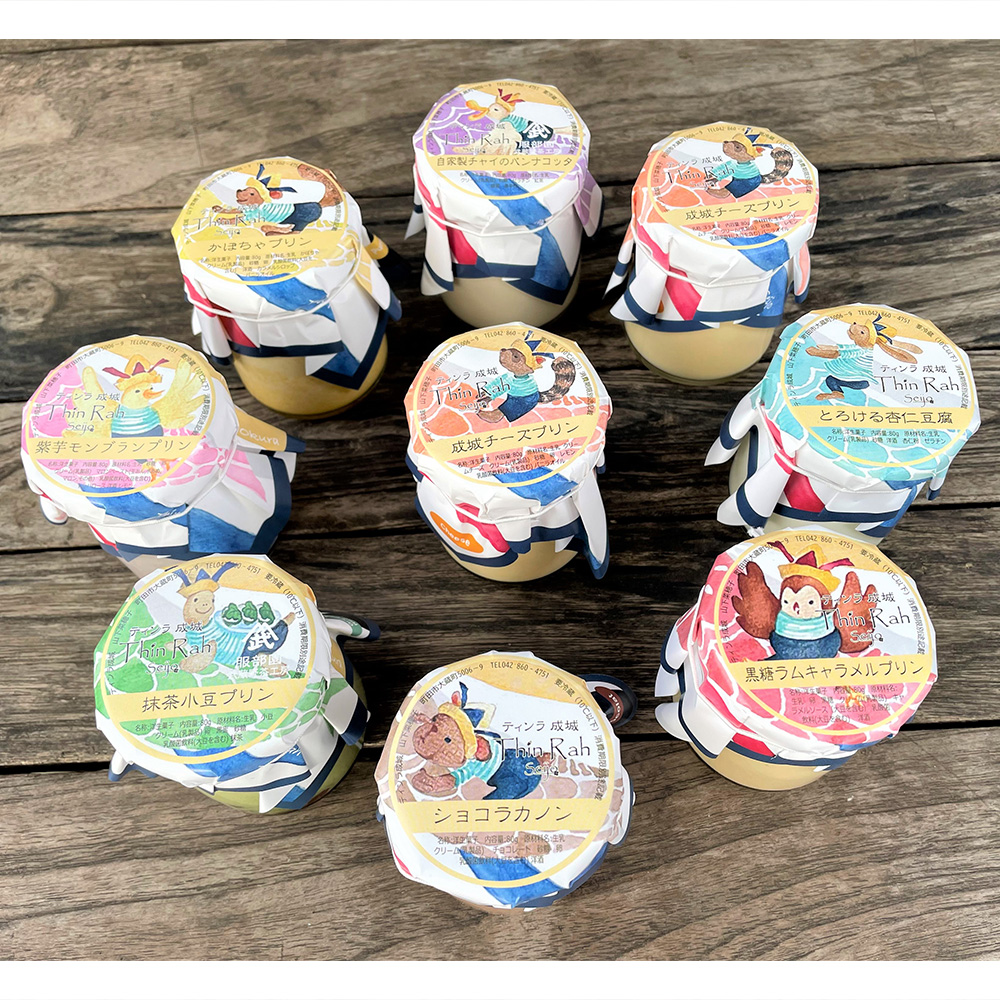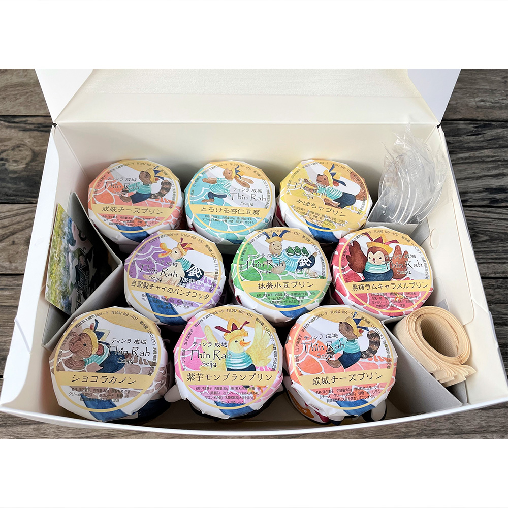 成城チーズプリン×2、とろける杏仁豆腐×1、抹茶小豆プリン×1、かぼちゃプリン×1、自家製チャイのパンナコッタ×1、黒糖ラムキャラメルプリン×1、ショコラカノン×1、紫芋モンブランプリン×1