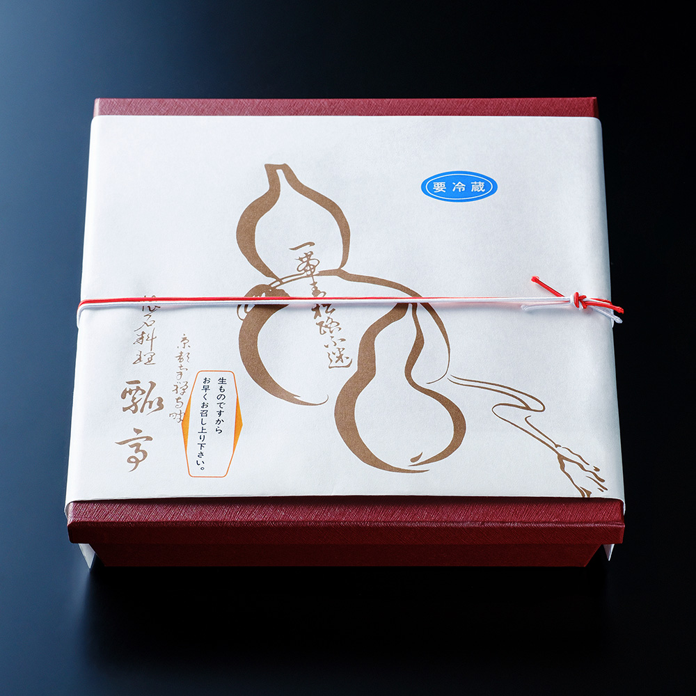豆ご飯(米(国産))、瓢亭玉子、穴子寿司(米(国産))、鱒塩麹焼、鰻八幡巻、白味噌入り厚焼き玉子、鯛求肥巻き、じゃこえのき、車海老つや煮、合鴨ロース、こごみ切り胡麻和え、一寸豆餅粉揚げ、茗荷甘酢漬、瓜奈良漬、揚湯葉、南瓜うま煮、鯛子、粟麩、楓麩、さやいんげん
