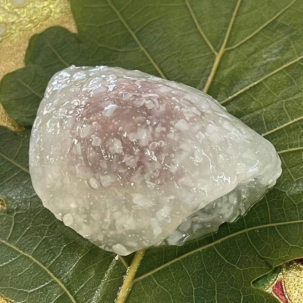 京都で修業された一宮市の萩原の銘店・川村屋賀峯総本店。このお店ならではの涼やかな葛生地に道明寺を散らして、こしあんをはさんだ葛製の柏餅。