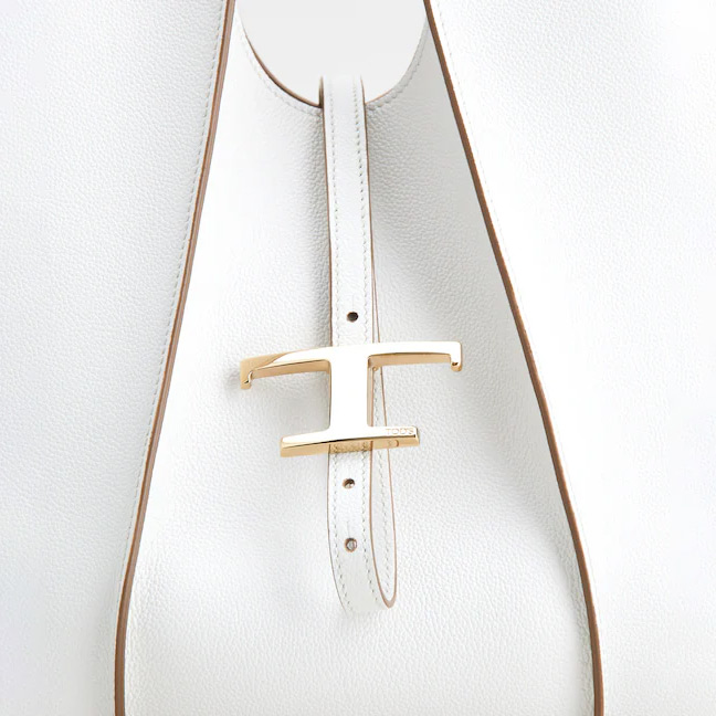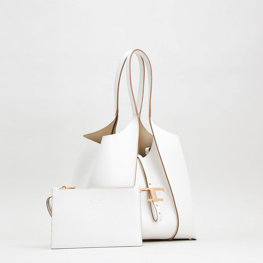 エレガントなハンマードレザーにリブを付け、しなやかな曲線を描くショッピングバッグ。ロゴ入りのトッズ T タイムレス メタル ペンダントアクセサリー、ダブルハンドル、大きな内部コンパートメントには取り外し可能なポーチが付いています。