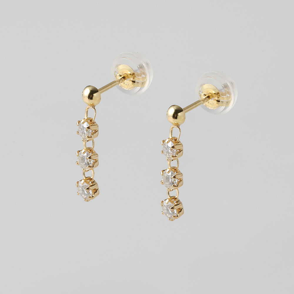 18金を使用したダイヤ3ストーンピアス。合計0.3ctのダイヤが動くたびに揺れるとっておきのピアスです。