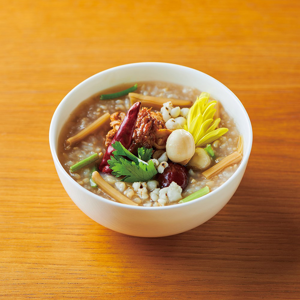 鶏出汁をベースに白米で作ったお粥3種には、はすの実、クコの実、ハトムギ、なつめ、金針菜の5種類の和漢食材を。野菜出汁をベースに玄米で作ったお粥2種には、5種類の和漢食材に加え、さらに花椒、シナモン、八角を加えた8種類の和漢食材を加えて食べやすいお粥に仕上げました。和漢食材の他、ナッツ類や豆類など、食感が楽しい食材をトッピングしています。具沢山で最後まで飽きずにお召し上がりいただけます。<黄ー南瓜>5種類の和漢食材と南瓜が入った、鶏出汁ベースのカレー風味のお粥。<翠ー緑豆>5種類の和漢食材とグリンピースなどの豆類が入った、鶏出汁ベースのお粥。<朱ーとまと>5種類の和漢食材とトマト、鶏肉、香草が入った、鶏出汁ベースのお粥。<玄米粥(鶏・旨辛)>8種類の和漢食材とピリ辛味の鶏肉が入った、野菜出汁ベースの玄米粥。<玄米粥(きのこ)>8種類の和漢食材ときのこ佃煮が入った、野菜出汁ベースの玄米粥。
