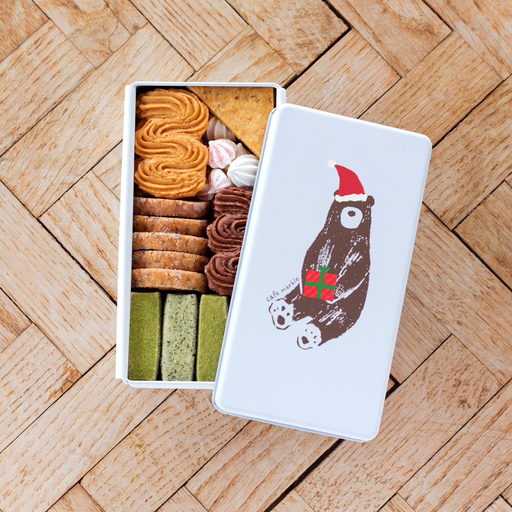 それぞれの味わいはもちろん、色や形、食感のバランスまで、cafe marbleのこだわりをぎゅっと詰め合わせました。クリスマス限定のタグでキュートなクマのクッキー缶に。