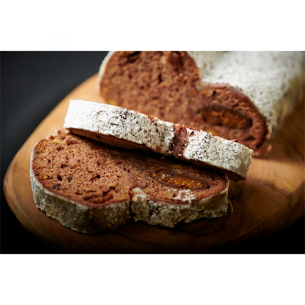 ドミニカ共和国産カカオ豆70%の濃厚なチョコレートを生地に練りこみ、オレンジピール、レーズン、ドライフィグ、くるみ、カカオニブを混ぜ込みました。オレンジピールはコアントロー、レーズンはラム酒、フィグはクローブ、スターアニス、レモンピール、シナモンをつけた赤ワインと、異なるリキュールに漬け込むことで素材の風味を最大限引き出した、奥行きのある味わいをお楽しみいただけます。仕上げにまぶしたカカオニブシュガーが、日を重ねるごとに熟成するシュトーレンの香りをより豊かに演出いたします。