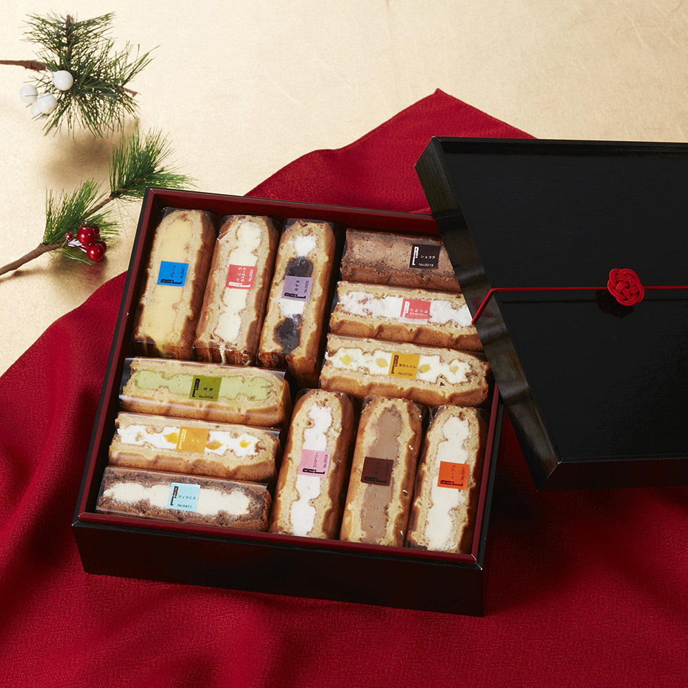 【冷凍便でお届けします。解凍まで時間がかかりますのでご注意ください。】ふんわりと焼き上げるこだわりのワッフル生地でフルーツやクリームをサンドした「ワッフルケーキ」12種類を、重箱に詰め合わせました。年末年始のご挨拶やお正月のギフト、家族団らんの時間やおもてなしにおすすめです。家族や親戚、友人とほっとあたたまるひとときをお過ごしください。