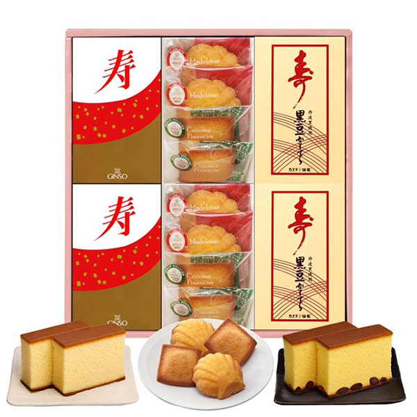 - 寿カステラ(5切れ1パック)×2個、寿 黒豆かすてら(5切れ1パック)×2個、焼き菓子4個入り(マドレーヌ2個、ココナッツフィナンシェ2個)×2個