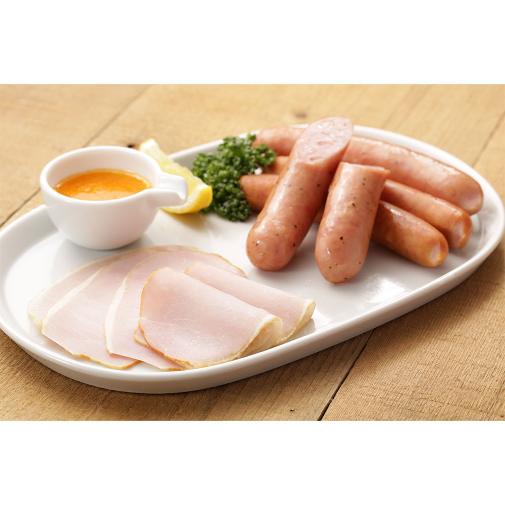 ロースハム400g×1、ハム用ドレッシング120mL×1、粗挽きフランク180g×1、ポークソーセージ150g×1