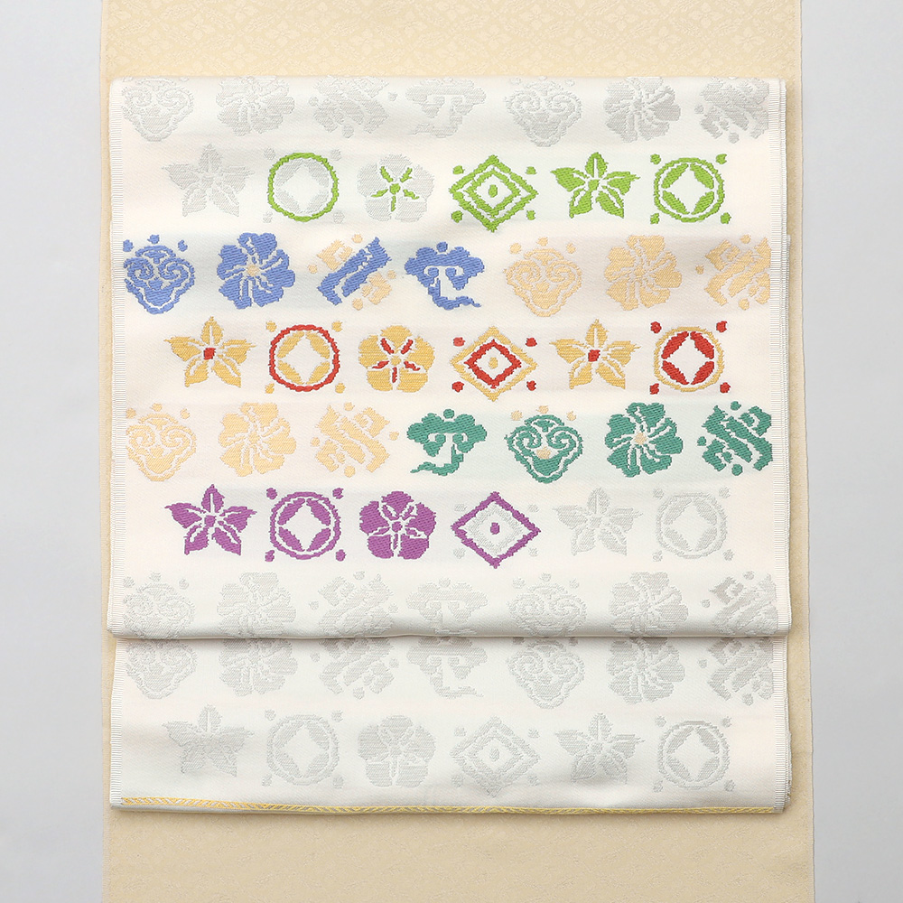 花文と宝尽くし文を一面に織り出した緞子。段ごとに色味を変えることで文様の並びを配色で美しく彩りました。優しく可憐な印象のなごや帯です。
