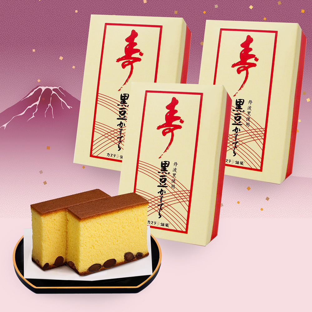 銀装カステラに丹波黒を敷き詰めた期間限定のカステラ。お正月の門出にふさわしい「寿」パッケージの商品です。※こちらは同じ商品を個別包装し3箱セットでお届けいたします。