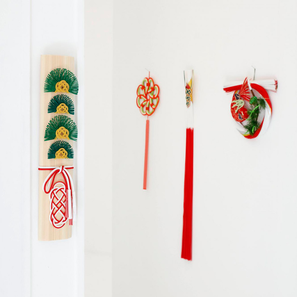 日本の伝統的な素材と技術を活かし新春のめでたさを表した床飾りです。古来水引は清浄を表し、また紅白は日本の祝い事に用いられる色の組み合わせです。室内用の新春飾りとして床の間はもちろん、リビングの壁などを床の間に見立てて飾るなどして、新春やおめでたい席などをお祝いください。マンションライフのインテリアにもマッチする佇まいです。