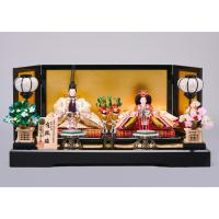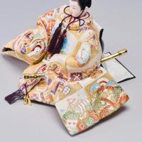 男雛の衣裳は繁栄を意味する「市松に宝尽くし」、女雛は富貴の象徴である「牡丹唐草と菱」。一緒に並ぶことで、末永い幸せを表現しています。