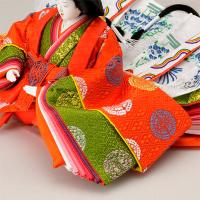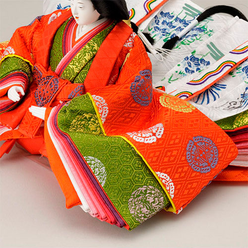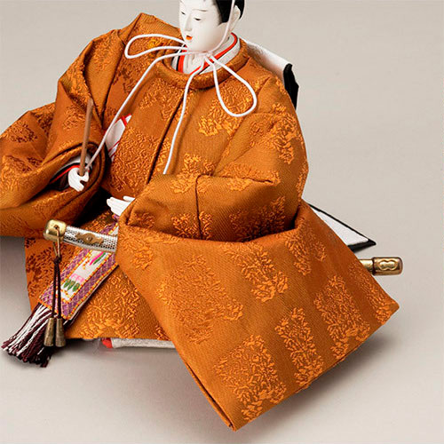 男雛には高貴な方が着用する「黄櫨染」を。女雛の袖口のグラデーションは梅の蕾が開いていく「春」を表現しています。